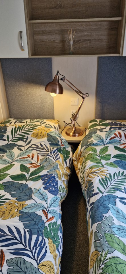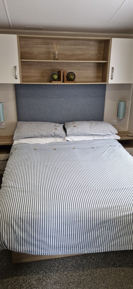 The master bedroom includes a double bed, built-in wardrobes, overhead storage and its own en-suite WC, while the twin bedroom is perfect for guests or family visits. There’s also a large family shower room with modern fittings.