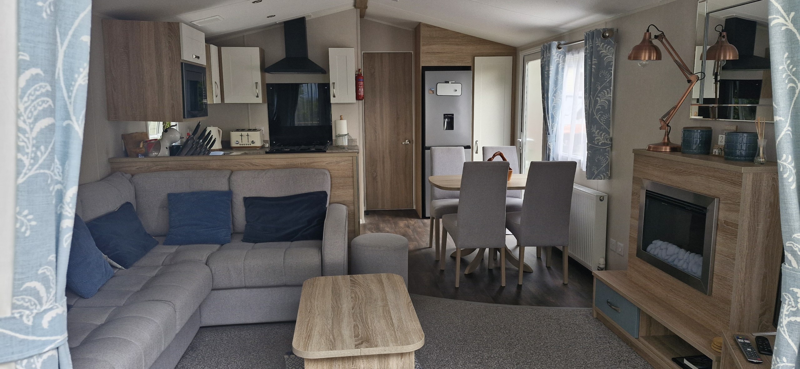 Inside, the Sierra impresses with its light-filled, spacious open-plan layout, with large sliding patio doors framing the scenery. Thoughtfully decorated in calming tones, the lounge features a comfortable sofa suite, a stylish feature fireplace and a smart TV setup, creating a cosy retreat year-round.