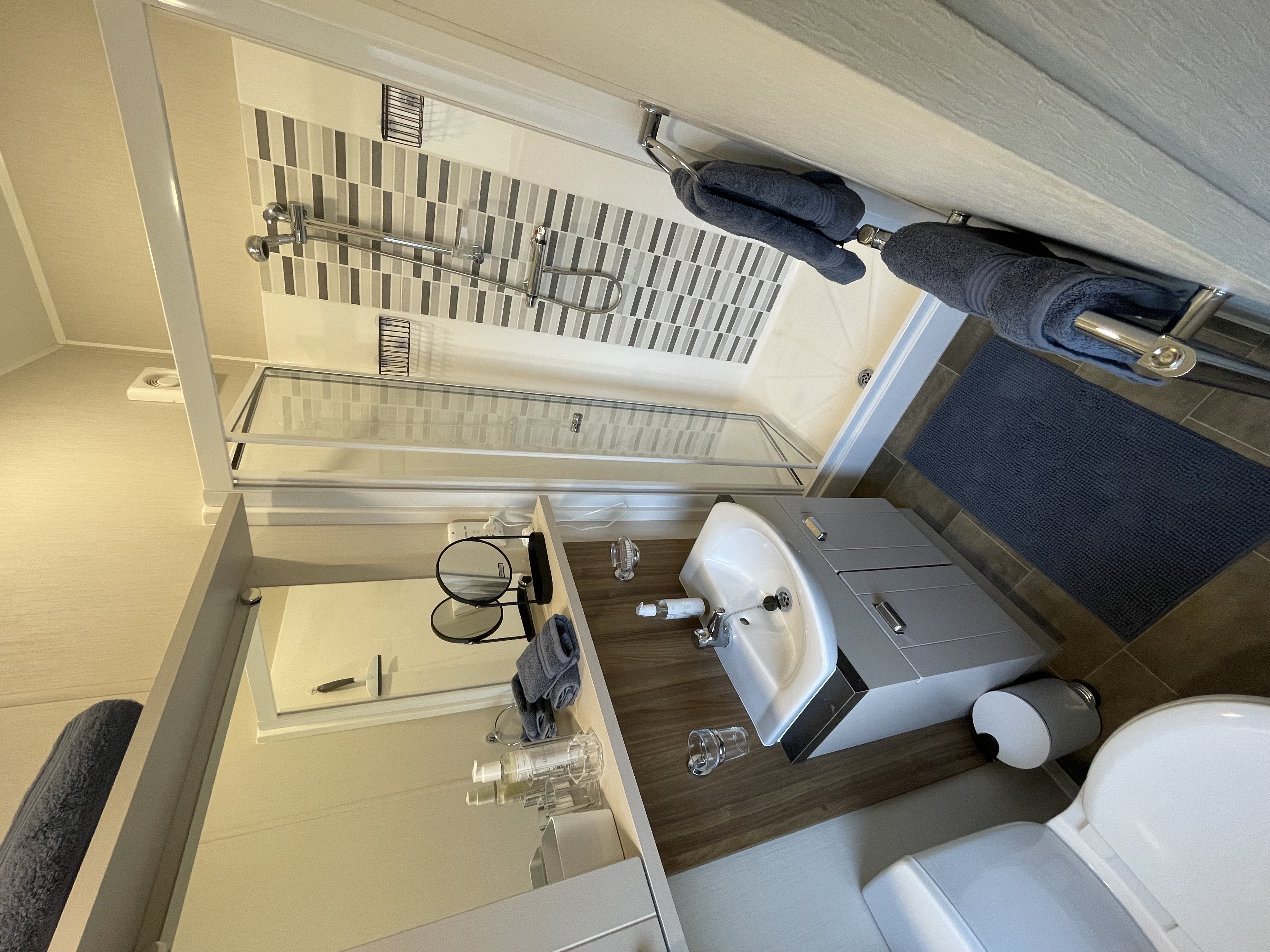 The family shower room has a toilet, wash basin and double shower.