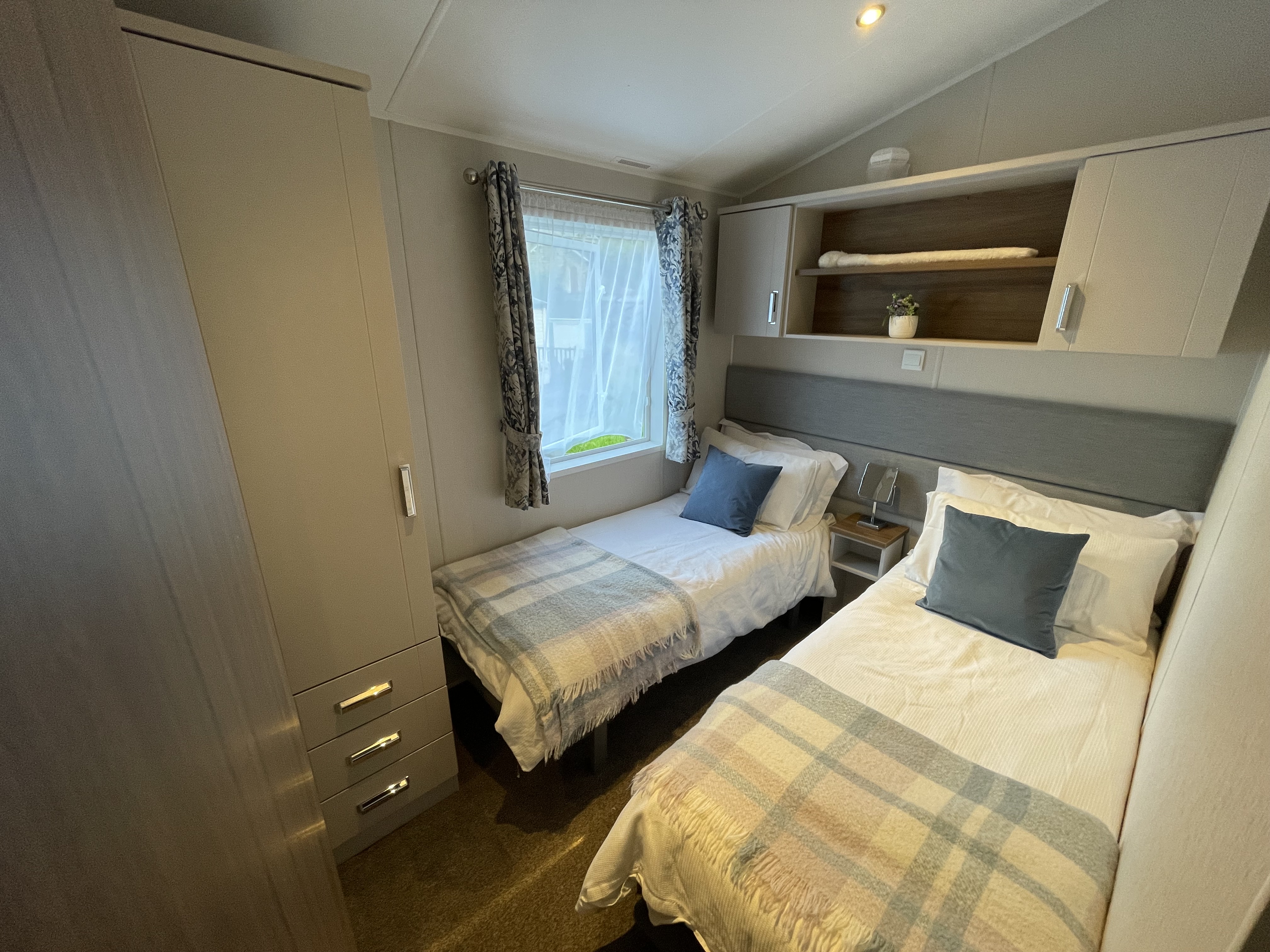 The single bedroom has 2 single beds with brand new memory foam mattresses, wardrobe and cupboards.