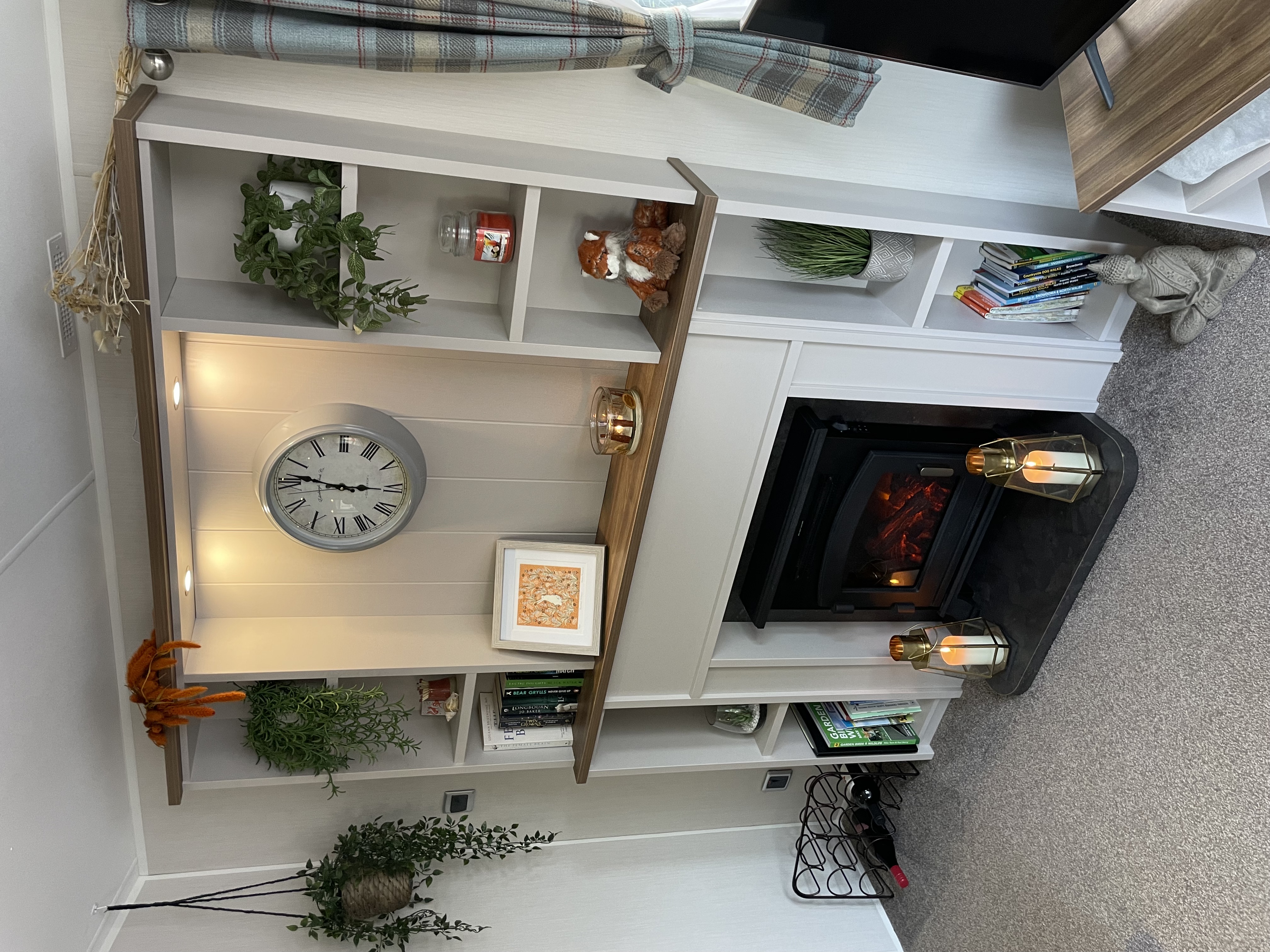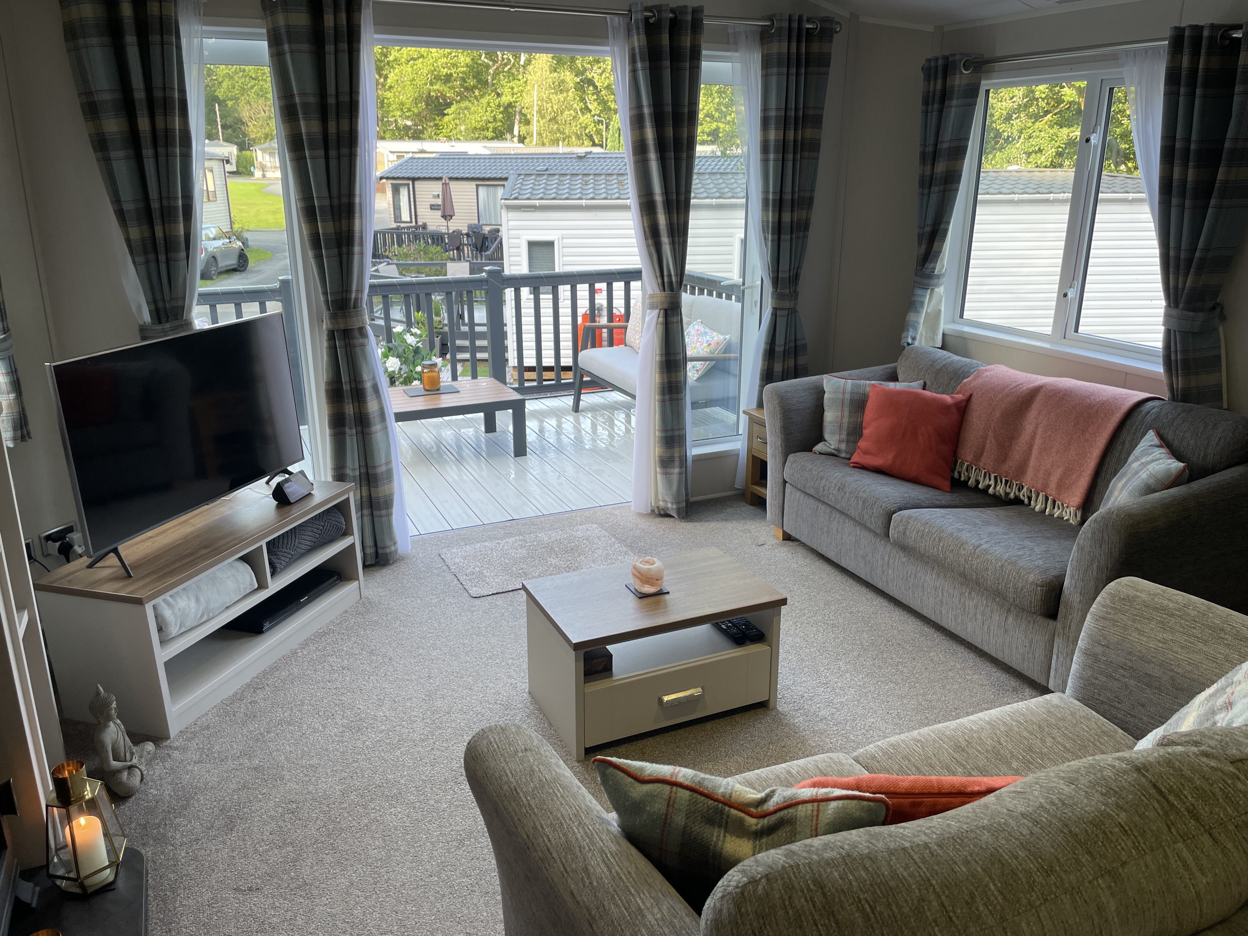 The lounge area has 2 x 2-seater sofas (one of which is a sofa bed), TV unit, coffee table and feature fireplace. Patio doors lead out onto the wonderful deck.